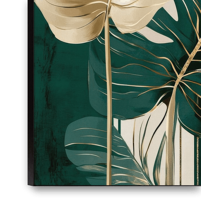 Een levendig bladerdak ontvouwt zich in een harmonieus samenspel van diepgroen en glinsterende gouden accenten. De weelderige monsterabladeren spreken van tropische pracht en elegantie, terwijl zachte lichtreflecties de kamer vullen met een vleugje luxe. Een visueel feest voor de zintuigen dat het samenspel van natuur en stijl viert.