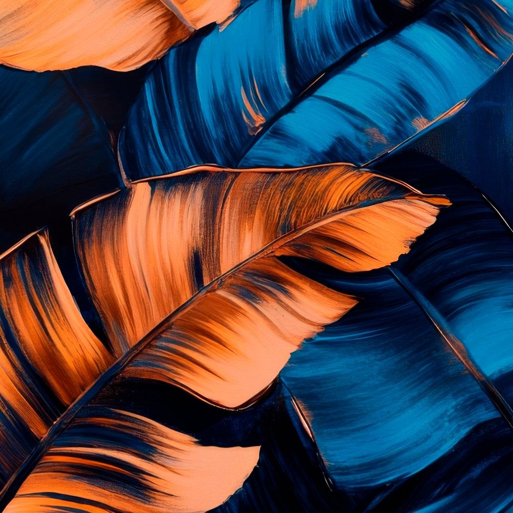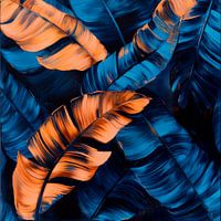 Gebogen bladeren ontvouwen zich in een harmonieus samenspel van diepblauw en feloranje, dat doet denken aan een tropische droom. De contrasterende kleuren brengen de scène tot leven en nodigen de kijker uit om zich onder te dompelen in de pulserende rust van een jungle waarin elke contour en schaduw een verhaal vertelt.