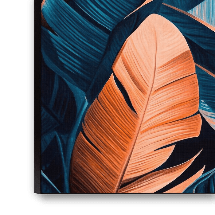 In een fascinerende dans van rijk blauw en warm oranje ontvouwen de bladeren zich als een levend schilderij. De gebogen lijnen en stralende kleuren creëren een harmonieuze compositie die doet denken aan tropische klimaten. Elke bladsteel vertelt over de kracht van de natuur, terwijl het heldere contrast de ogen betovert en uitnodigt om te dromen.