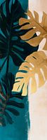 Gouden bladeren dansen op een diep, rustgevend turkoois, terwijl delicate penseelstreken in zachte aardetinten van achteren tevoorschijn komen. Deze harmonieuze compositie combineert tropische elegantie met moderne esthetiek en creëert een gevoel van exotische rust. Een oase van kleur die de kamer vult met een vleugje natuur en luxe.
