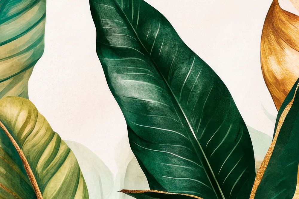 Elegante bladvormen dansen in het zachte licht, hun diepgroene tinten harmoniëren met warme gouden en roze accenten. Deze ingewikkelde bladeren vertellen verhalen van exotische plaatsen en nodigen je uit om te dromen. Hun levendige diversiteit en maritieme structuren geven het tafereel een bijna magische sfeer, alsof de natuur zelf haar kleuren viert.