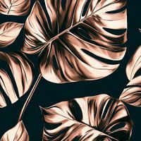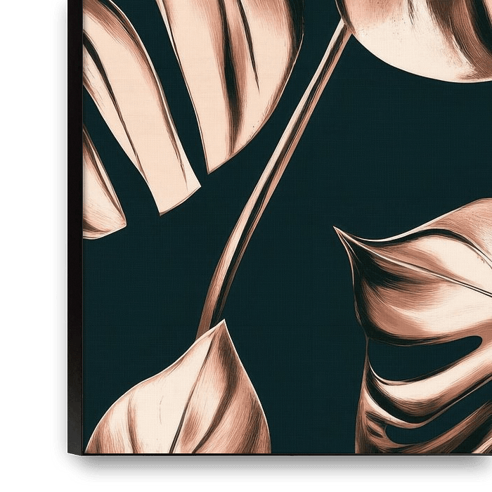 Weelderige bladeren in glanzende goud- en bruintinten ontvouwen zich op een diepe, mysterieuze achtergrond. Hun opvallende nerven en gebogen contouren geven het geheel een elegante dynamiek en nodigen uit om te dromen. Deze botanische compositie straalt een gevoel van exotische luxe en harmonieuze nabijheid tot de natuur uit.