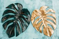 Twee prachtig vormgegeven bladeren, een in elegant zwart en de ander in glinsterend goud, dansen op een zachte aquatische achtergrond. Hun gebogen contouren en harmonieuze contrast geven het geheel een gevoel van luxueuze natuur en tijdloze elegantie dat uitnodigt om te blijven hangen en je te verwonderen.