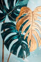 In een harmonieus samenspel van intense groene tinten en luxueus goud ontvouwen de imposante bladeren zich als een tropische oase. De rijke kleuren en glanzende oppervlakken geven de compositie een frisse elegantie, terwijl de zachte achtergrond een rustgevende sfeer creëert. Een vleugje vibratie en natuur betoveren de kijker.
