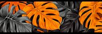 Een fascinerend samenspel van fel oranje en diep zwart voert de kijker mee naar een tropische oase. De dynamische bladstructuren dansen tegen elkaar, terwijl het stralende oranje opvalt en levendige energie uitstraalt. Deze compositie ensceneert de natuur op een kunstzinnige manier die zowel rustgevend als uitnodigend is.