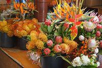Deze foto aan de muur hangen is voordeliger dan elke week verse bloemen kopen. Foto van mooie boeketten op de markt in Funchal, Madeira.