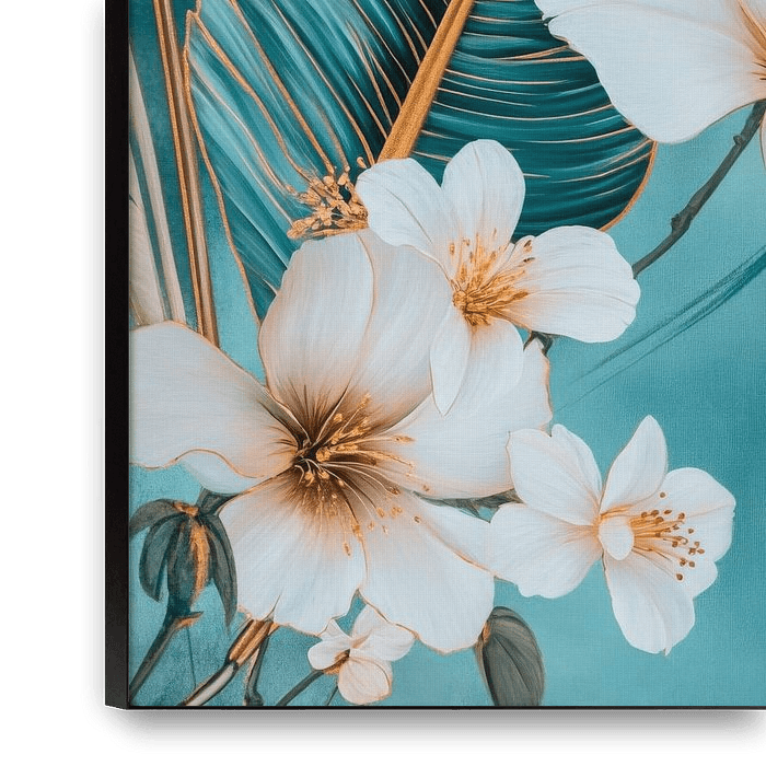 Een tropisch paradijs ontvouwt zich in zachte pastelkleuren: Grote, levendige bladeren strelen tere witte bloesems, waarvan de filigrane vormen een vleugje elegantie uitstralen. De harmonieuze kleurencombinatie van blauw en goud geeft het beeld een kalmerende en verfrissende uitstraling, alsof je droomt in de schaduw van een weelderige…