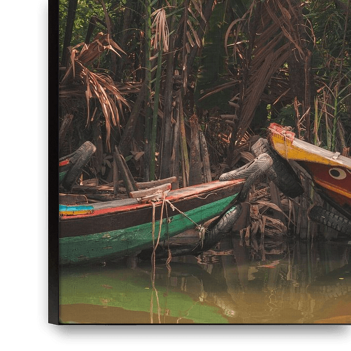 Deze bijzondere foto legt de natuurlijke schoonheid van de Mekongdelta in Vietnam vast. Twee traditionele, kleurrijk beschilderde vissersboten liggen rustig aan de rand van de rivieroever, omringd door een weelderige, groene palmenjungle. De levendige kleuren van de boten, het dichte gebladerte en de weerspiegeling in het kalme water…
