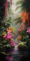 Heel mooi prachtig landschap met water en bergenArt Bizarre Tropische bloemen achtergrondArt Bizarre