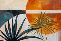 Dit moderne schilderij combineert geometrische vormen met levendige, tropische bladeren tot een fascinerende compositie. De weelderige groene tinten van de bladeren contrasteren harmonieus met de warme aardetinten en koele pasteltinten op de achtergrond. De heldere lijnen en het uitgebalanceerde kleurenpalet geven het werk een…