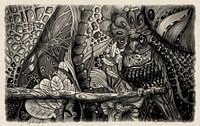 Deze prachtige tekening in zwart-wit met een vleugje sepia legt de fascinerende schoonheid van een papegaai in de jungle vast. Met een meesterlijke aandacht voor detail en een licht abstracte weergave wordt de unieke gratie en exotische flair van de papegaai tot leven gebracht.