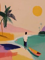 Dit kunstwerk toont een dromerige tropische strandscène in een moderne, expressieve stijl met een palet van zachte, warme tinten. De compositie toont een menselijke figuur in een wit shirt en blauwe broek die staat aan de rand van een turquoise zee. Een kleine, kleurrijke boot (geel en groen) ligt op het zandstrand.