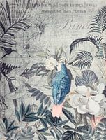 Papegaai in tropische vegetatie met bloemen en bladeren en vintage tekst