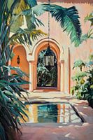 Een vleugje exotisme omringt deze uitnodigende binnenplaats, waarvan de zachte kleuren en weelderige planten een gevoel van rust en ontspanning uitstralen. De fascinerende lantaarn wiegt zachtjes, terwijl de weerspiegelingen in het water de mysterieuze sfeer benadrukken. Hier smelten architectuur en natuur samen tot een harmonieus toevluchtsoord.