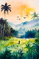 Te midden van weelderige groene landschappen strekt de horizon zich zachtjes uit terwijl gouden zonnestralen de hemel verwarmen. Een eenzame wandelaar loopt door het hoge gras, omringd door schaduwrijke palmbomen en levendige vogels die door de lucht vliegen. Deze dromerige scène straalt rust en een gevoel van ontdekking uit.