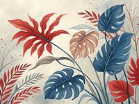 Dit levendige aquarelschilderij legt de weelderige schoonheid van een tropisch oerwoud vast. Grote bladeren in diepblauwe, warme terracotta en vurig rode tinten lopen door elkaar en creëren een dynamische en fascinerende compositie. Delicate stengels weven door het gebladerte en voegen een gevoel van diepte en beweging toe aan deze viering van het levendige palet van de natuur's.