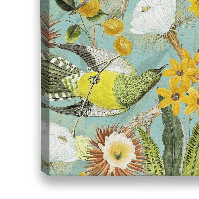 Koop dit bloemen kunstwerk Tropische vintage vogels in de jungle van Floral Abstractions op canvas, aluminium dibond, (ingelijste) fotoprint, behang en ArtFrame, op maat geprint in Fine-Art kwaliteit.