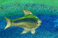 Dit kleurrijke kunstwerk is deels abstract en deels realistisch. Er is duidelijk een vis te zien, maar de kleurrijke achtergrond is abstract.