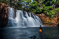 Deze geweldig mooie en brede waterval heet Eureka en ligt in Mauritus. Op dit Afrikaanse eiland zijn diverse mooie watervallen te vinden. De bruine rotsen en de groene vegetatie zijn weelderig. De lokale inwoner bleef met zijn gele zwembroek net lang genoeg stil staan om nagenoeg onbewogen in beeld te komen en te blijven.