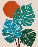 Deze moderne minimalistische illustratie heeft drie gestileerde Monstera bladeren in verschillende tinten groenblauw en diepgroen, tegen een bleke achtergrond met een levendige oranje zonachtige cirkel. De strakke lijnen en het gedurfde kleurenpalet roepen een gevoel op van natuurlijke rust en eigentijds design, en doen denken aan Matisse's botanische uitsneden.