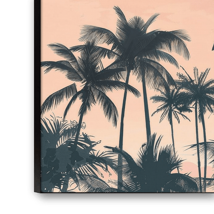 Deze rustgevende afbeelding van een tropische zonsondergang vangt de schoonheid en sereniteit van de natuur. De silhouetten van palmbomen en vogels tegen de zachte avondlucht creëren een vredige en ontspannen sfeer. Ideaal voor woonruimtes die op zoek zijn naar een tropische en rustgevende decoratie.