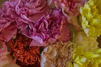 Liggende beeldvullende afbeelding van een klein kleurrijk boeket trosanjers (Dianthus caryophyllus) in geel, roze, oudroze en oranje. De bloemblaadjes zijn erg mooi zichtbaar en van boven gefotografeerd.