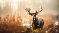 De eland, statig en onbewogen, kijkt direct in de lens, zijn geweien als natuurlijke kroon verheffend tegen de wazige achtergrond van het woud. De lichte nevel hangt tussen de bomen en versterkt de…