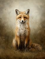 Dit imposante portret toont een volwassen vos die statig rechtop zit in een weids graslandschap. Zijn oranje vacht, met zachte grijze en witte accenten, geeft hem een indrukwekkende, koninklijke uitstraling. De vos kijkt zelfverzekerd en rustig naar voren, alsof hij de natuur om zich heen overziet. De subtiele waas in de achtergrond en de delicate grassprieten rondom hem versterken de rustige sfeer en leggen de nadruk op zijn elegante verschijning. Dit beeld straalt zowel kracht als sereniteit uit, waardoor de vos de ware hoofdrolspeler in zijn natuurlijke omgeving lijkt te zijn.