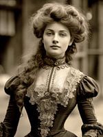 Dit portret toont een vrouw wiens verschijning wordt gekenmerkt door trotse gratie en tijdloze elegantie. Haar rechte houding en heldere, zelfverzekerde blik stralen kracht en waardigheid uit. Haar haar is vakkundig opgestoken, volumineus en zacht, waardoor haar gezicht benadrukt wordt. Het kapsel weerspiegelt de stijl en verfijning van het Victoriaanse tijdperk.