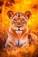 Te midden van gloeiende gouden grassen straalt de majestueuze leeuwin een indrukwekkende aanwezigheid uit. Haar doordringende blik en het zachte licht geven het moment een bijna magische uitstraling. Dit kunstwerk past perfect in een woonkamer, waar het fungeert als een tijdloos statement en conversatiestarter.