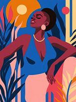 Dit kunstwerk toont een gestileerde, elegante figuur in een minimalistische maar levendige compositie. Het centrale onderwerp is een vrouw met een donkere huid, gekleed in een blauwe jurk met één schouder. Haar houding is sierlijk, met één arm omhoog naar haar hoofd alsof ze nadenkt of ontspant. Haar korte, gestructureerde haar…