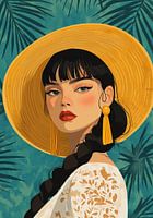 Vectorafbeelding van een vrouw met zwart gevlochten haar en een mooie zomerse geelgouden hoed met oorbellen in dezelfde kleur. De achtergrond is prachtig blauw met een jungle blad erin. In haar witte jurk zit een gouden bladmotief verwerkt. Modern.