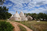Onverharde oprijlaan naar witte stenen trulli huizen met kegelvormige daken met oude olijfbomen in de tuin in een landschap in de buurt van Alberobello in Puglia in het zuiden van Italië.