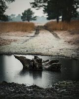 Een oude boomstronk in de grond. Hoeveel wandelaars zouden hier simpel aan voorbij lopen. In andere condities zou het mij niet opvallen maar met de vorst was de plas water bevroren en ontstond een heerlijk rustig beeld. Een beetje rijp op het gras erbij bevestigd het winterse gevoel.