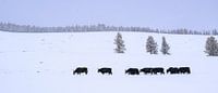 Een kudde jaks trekt door het besneeuwde landschap in Centraal-Mongolië tijdens een sneeuwstorm.