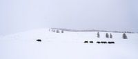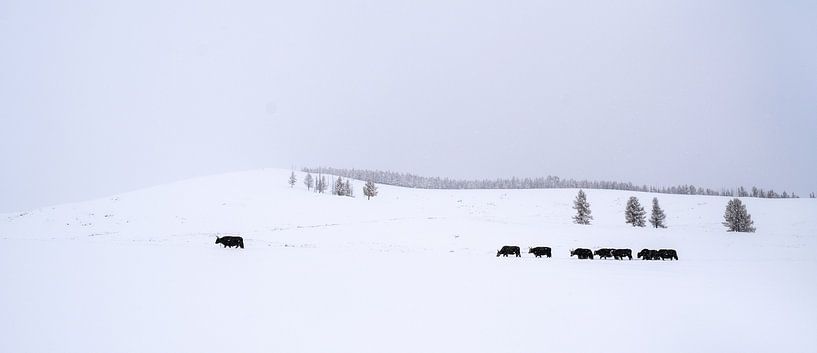 Een kudde jaks trekt door het besneeuwde landschap in de buurt van Tsenkher in Centraal-Mongolië.