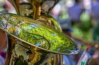 Close up van een tuba met de weerspiegeling van groene bladeren tijdens een optreden buiten
