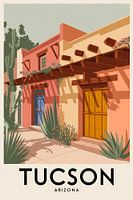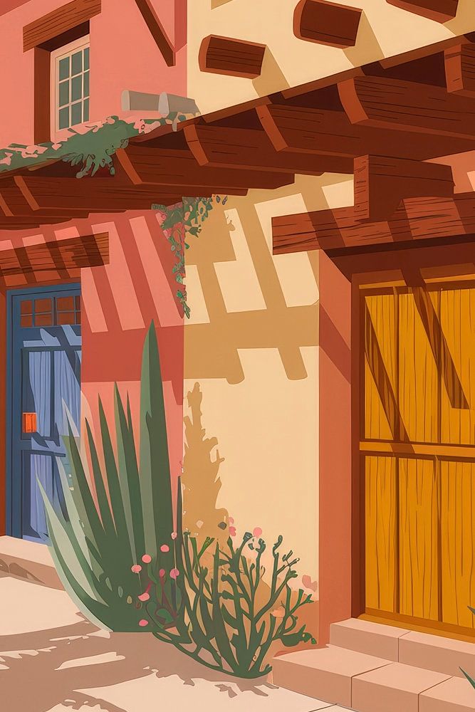 Een levendige expressie van zuidwestelijke architectuur die vreugde uitstraalt met warme kleuren en opvallende deuren. De harmonieuze combinatie van aarde en vegetatie spreekt van rustieke charme en uitnodigende stemmingen. Perfect voor de woonkamer om een ontspannen sfeer te creëren en gesprekken te inspireren met een vleugje Arizona.
