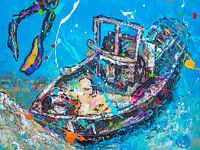 De sleepboot die bij het strand van Tugboat beach onder water ligt. Ideaal voor snorkelen van de kunstenaar Renate Rolefes.