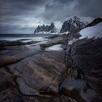 Koop de foto Tugeneset rocky coast with mountains in background, Norway van Wojciech Kruczynski als print op canvas, aluminium dibond, (ingelijste) fotoprint, behang en ArtFrame. Voor jou op maat geprint in Fine-Art kwaliteit.