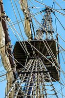 Foto tuigage historisch zeilschip met mast gereefd zeil en tuigage voor blauwe lucht