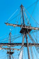 Foto tuigage historisch zeilschip met mast gereefd zeil en tuigage voor blauwe lucht