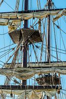Foto tuigage historisch zeilschip met mast gereefd zeil en tuigage voor blauwe lucht