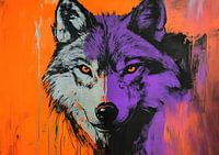 Tuin Paarse Wolf - Op dit dieren schilderij zie je een groot, krachtig paarse wolf met felle oranje achtergrond en opvallende gele ogen, wat het schilderij een moderne en abstracte uitstraling geeft.
