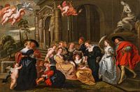 Schilderij met mannen en vrouwen voor een beeld waarin een vrouw als fontein fungeert en onder meerdere engelen of cupido's.