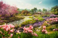 Tuin met kleurrijke bloemen in de zomer, illustratie