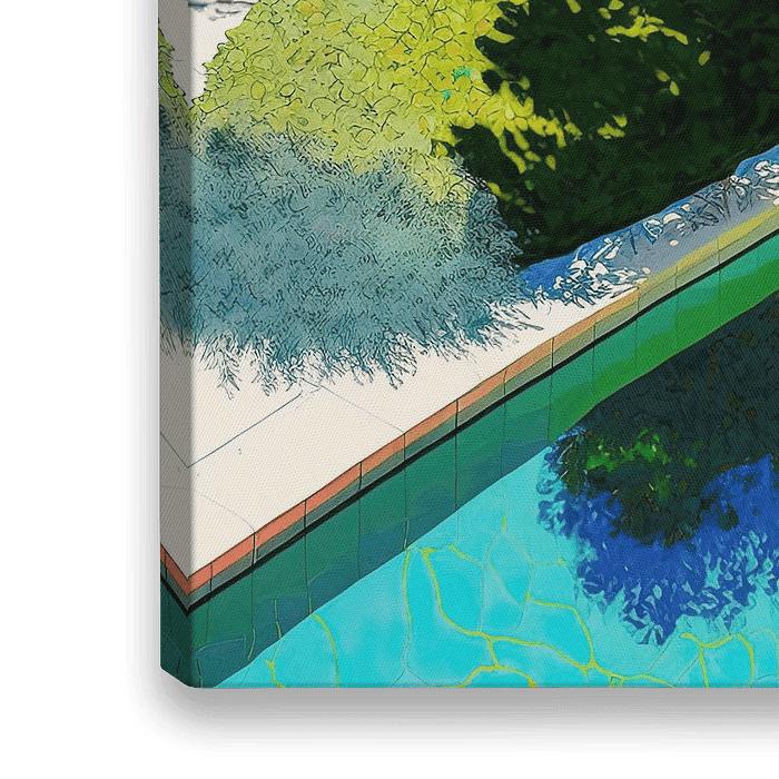 Het werk toont een zwembad in een tuin, gezien vanuit een verhoogd perspectief. De compositie richt zich op de hoek van het zwembad, waar water, betegeling en beplanting samenkomen. In het water zijn schaduwen zichtbaar van struiken en bomen die zich buiten het kader bevinden. Langs de rand groeien…
