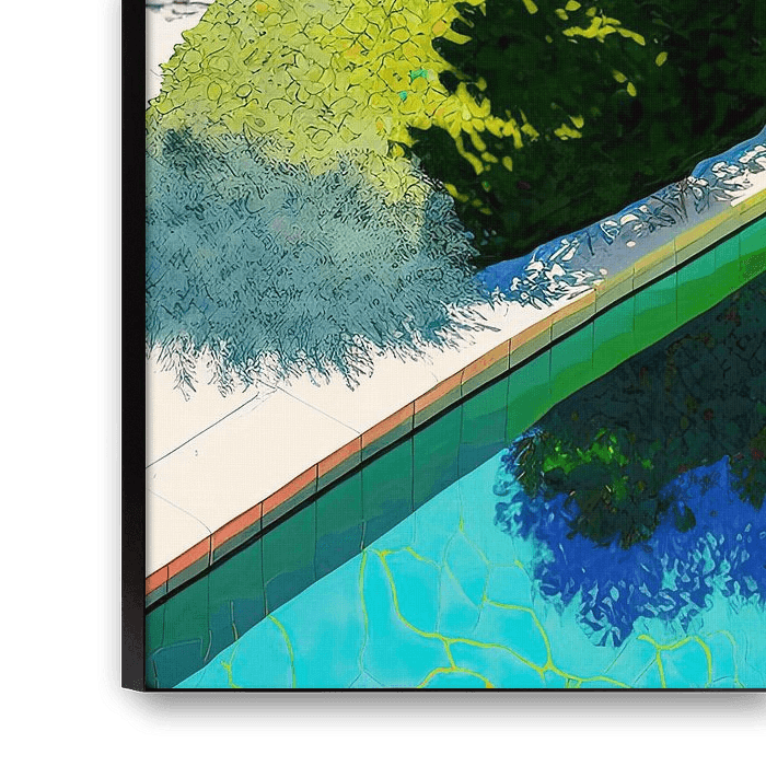 Het werk toont een zwembad in een tuin, gezien vanuit een verhoogd perspectief. De compositie richt zich op de hoek van het zwembad, waar water, betegeling en beplanting samenkomen. In het water zijn schaduwen zichtbaar van struiken en bomen die zich buiten het kader bevinden. Langs de rand groeien planten in diverse vormen, met duidelijke afscheidingen in kleur en textuur. Het beeld is verdeeld in vlakken met heldere contouren, waarin wateroppervlak, begroeiing en bestrating elkaar afwisselen. De reflecties in het water versterken het gevoel van diepte en gelaagdheid.