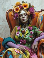 Een jonge vrouw zit in een weelderige oranjekleurige fauteuil en lijkt kalm en nadenkend, alsof ze stilstaat voor een moment van herinnering.Het gezicht verraadt een subtiele melancholie, die zichtbaar is in de licht neergeslagen ogen en de zachte lijn rond de lippen.De delicate sproeten en het zachte gezicht laten een kwetsbare, bijna…