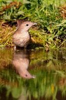 Tuinfluiter (Sylvia borin) zittend op de oever van een vijver in het voorjaar.